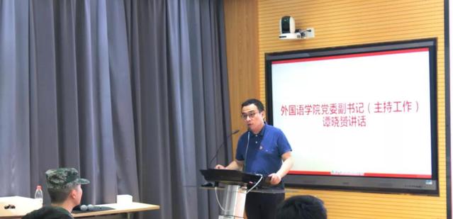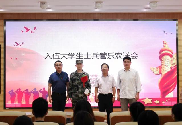 近日,参军入伍的外国语学院英语系2019届毕业生管乐同学启程前往部队。外国语学院新兵入伍欢送会在汇文楼召开。学院党委副书记(主持工作)谭晓赟、党委副书记徐伟铖、英语系主任魏耀章、学工办主任李小蜜、辅导员李伟伟、入伍新兵管乐及各年级学生代表出席大会。团委书记刘佳煊主持大会。