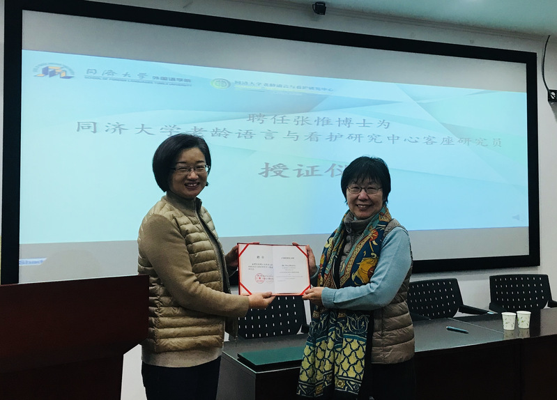12月25日下午,同济大学老龄语言与看护研究中心在同文楼214报告厅举行授证仪式,聘任香港城市大学张惟研究员为研究中心客座研究员。 外国语学院副院长陈琳教授向张惟研究员颁发了聘书,研究中心秘书长黄立鹤副...